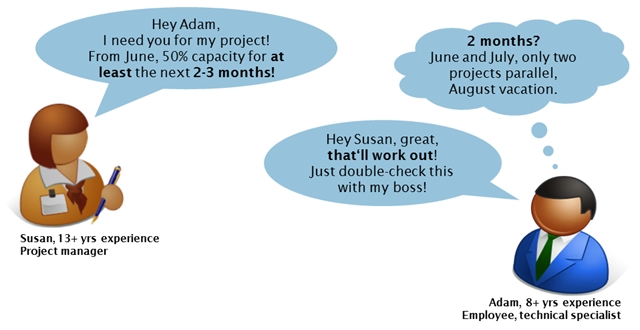 The project manager asks for at least 2-3 months and the resource tempts to confirm this (there are many reasons for this). Let’s put this on a communication level: Adam receives the question with ‘2 months’ (sender-receiver-issue). And since this would work out, he simply confirms.